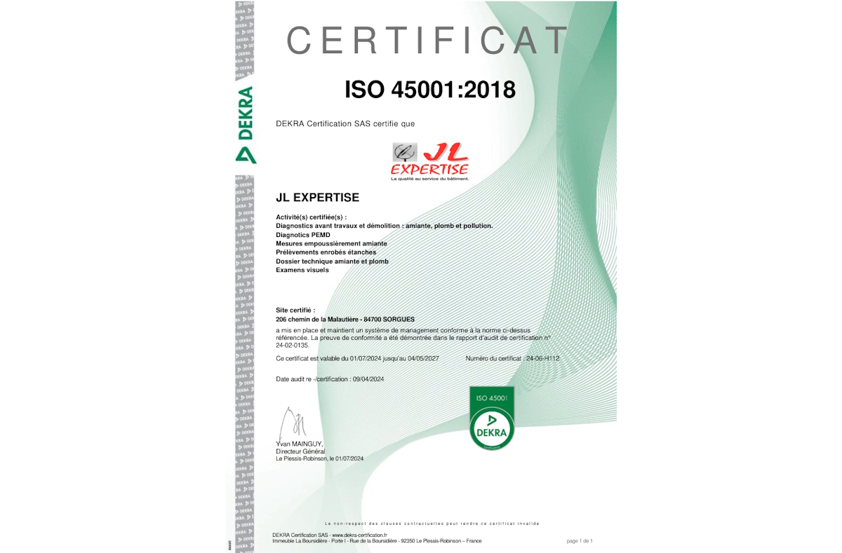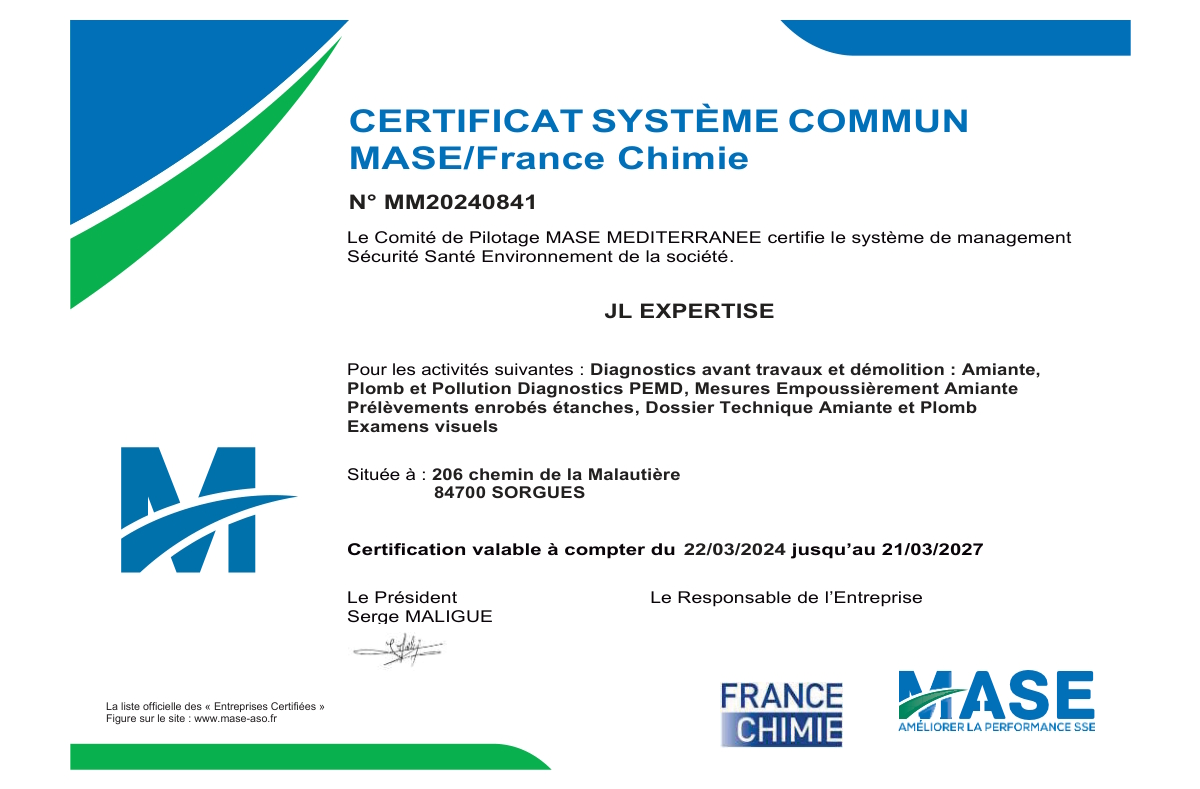 Un mode opératoire (SS4) de prélèvement rédigé par le cabinet JL EXPERTISE est scrupuleusement respecté. Cette note est transmise à l'inspection du travail du département du Vaucluse (siège social de la société).
